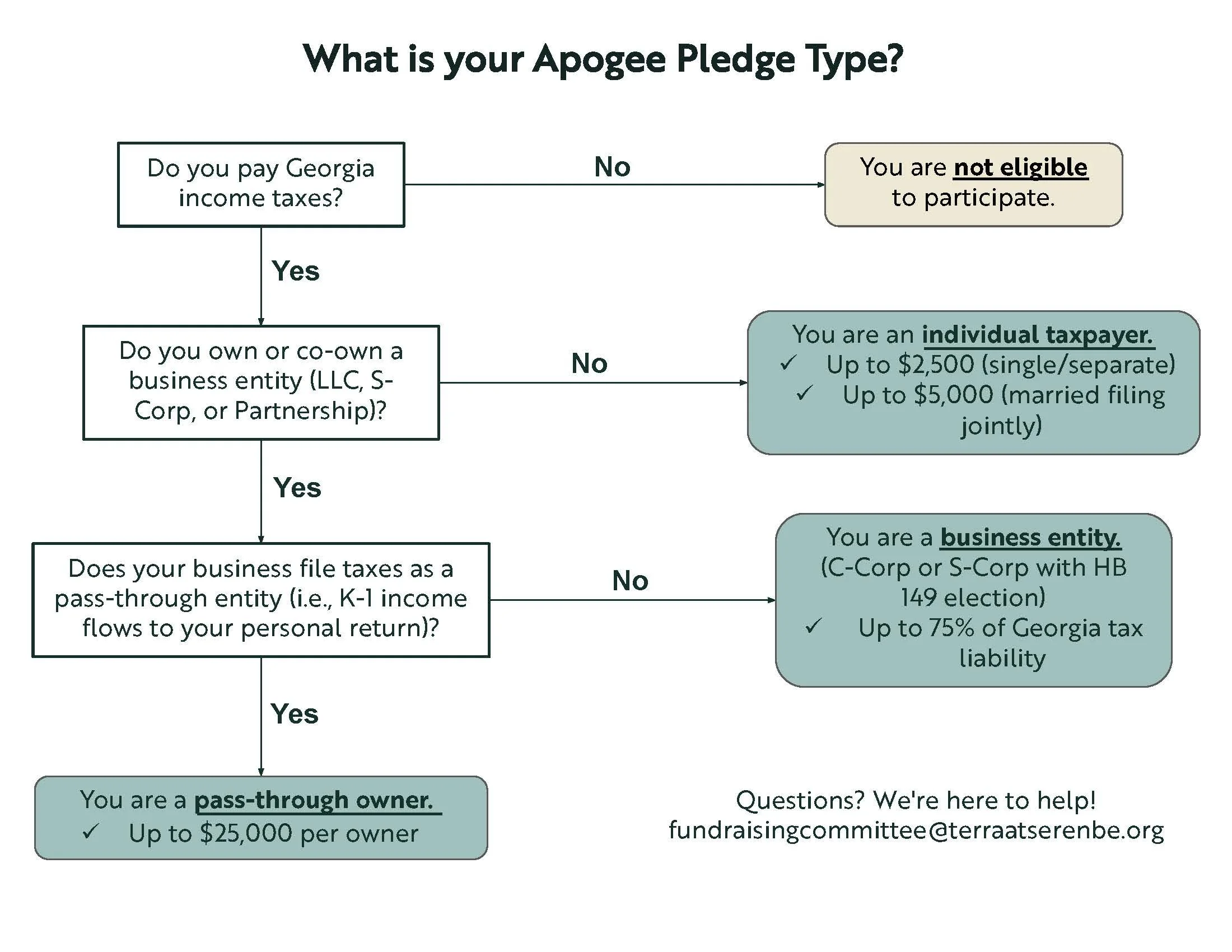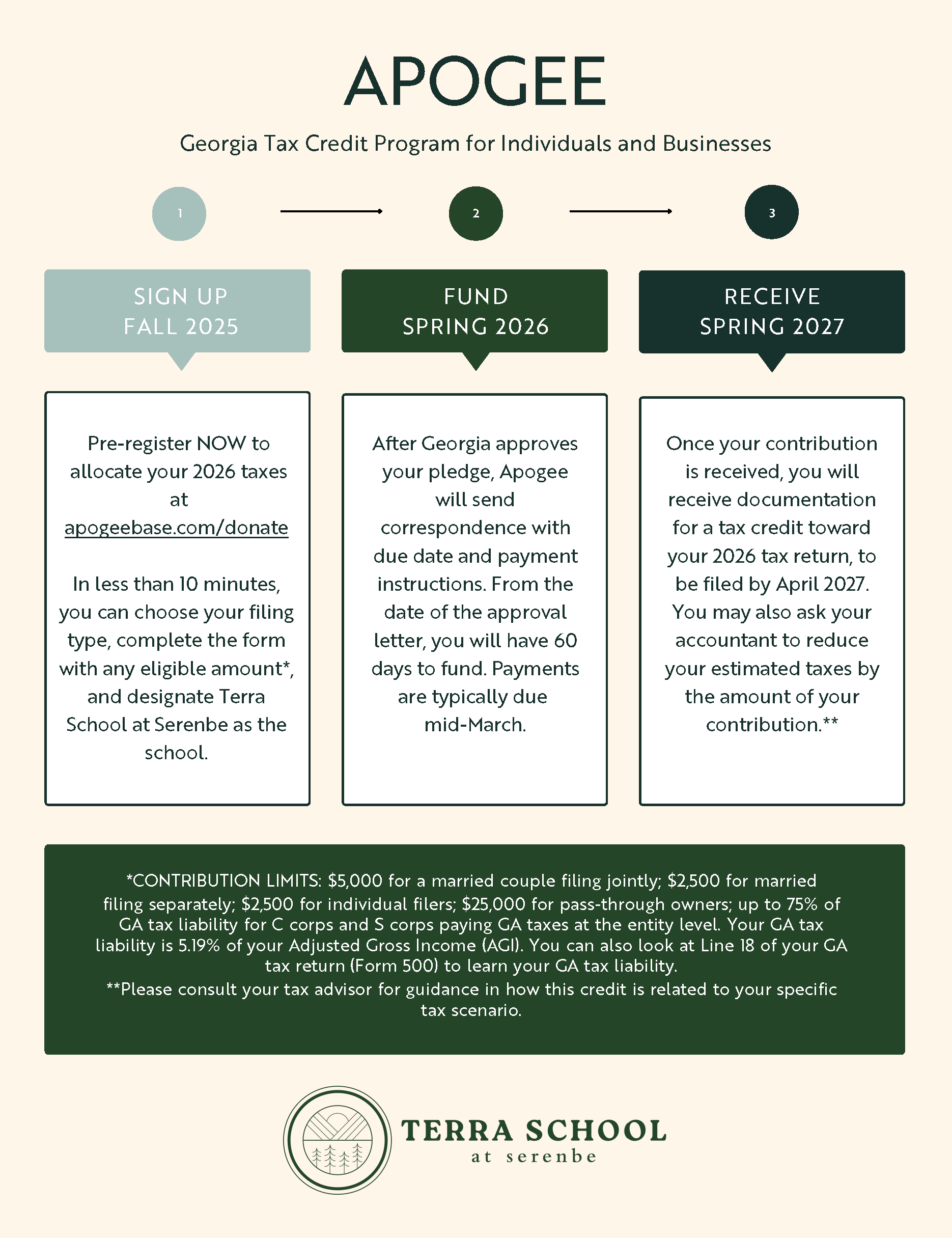 Through this partnership, you can contribute to Apogee and receive a dollar-for-dollar credit on your Georgia state income taxes. Your contribution is held in a fund managed by Apogee for Terra to help eligible K-12 students. Apogee manages the program donations and works directly with Terra in the financial aid process.