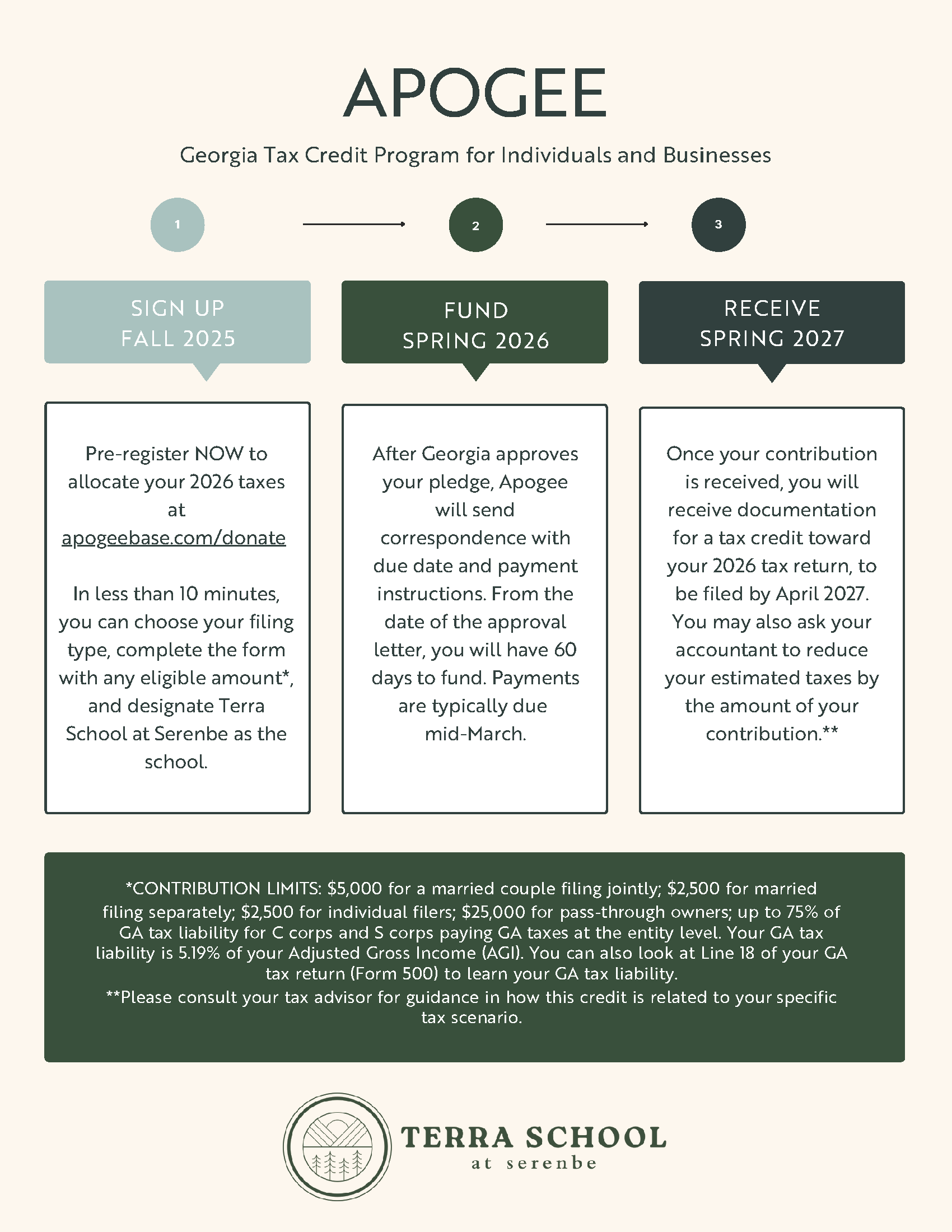 Through this partnership, you can contribute to Apogee and receive a dollar-for-dollar credit on your Georgia state taxes. Your contribution is held in a fund managed by Apogee for Terra at Serenbe to help eligible K-12 students. Apogee manages the program donations and works directly with Terra at Serenbe in the financial aid process. Signing up takes only a few minutes, and we are here to help!